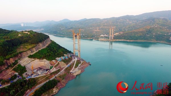 主跨為1020米的新田長江大橋一跨過江,系雙塔單跨鋼箱梁懸索橋,也是重慶目前在建的最大跨徑橋梁。懸索橋素有“橋梁皇后”之稱,曲線柔美的主纜,橫跨于江面的鋼箱梁,與高高矗立于江邊的主塔,組成的“幾何”構(gòu)圖,既有強(qiáng)勁的剛性氣魄,也有優(yōu)雅的柔性氣韻。
